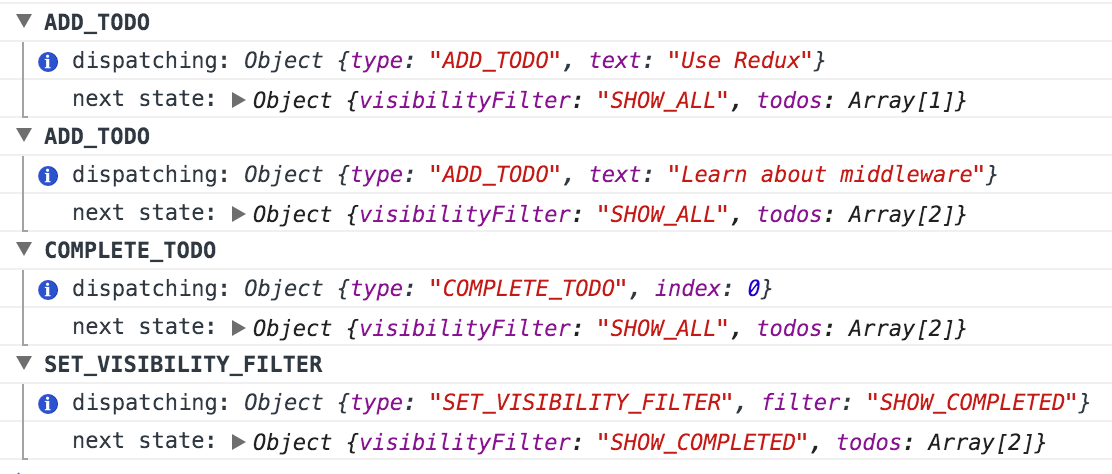 가장 세련되지 못한 방법은 store.dispatch(action)을 호출할때마다 액션과 다음 상태를 직접 로깅하는겁니다. 이건 방법이라고 하기도 어렵고 문제를 이해하기 위한 첫 단계일 뿐이죠.